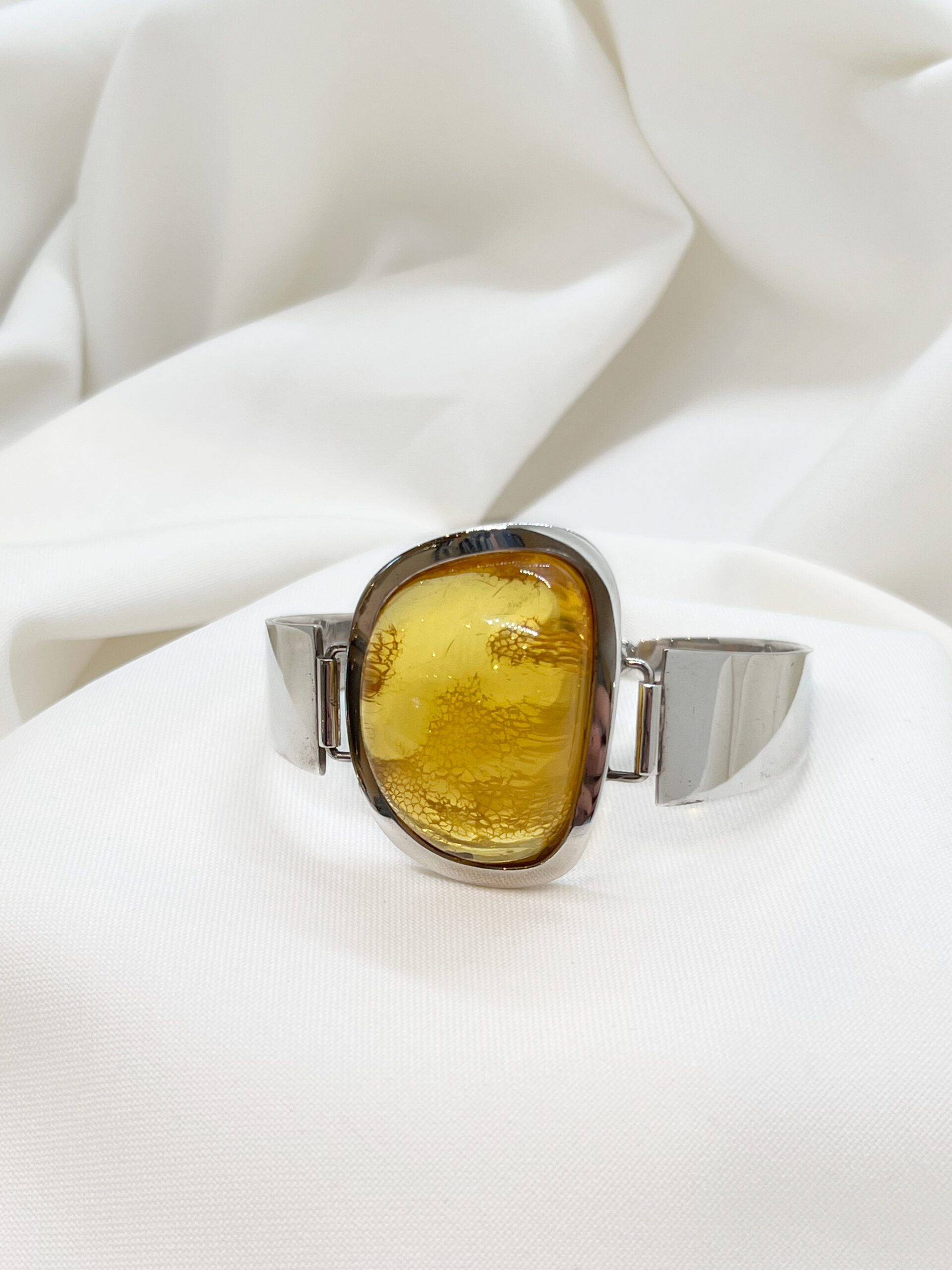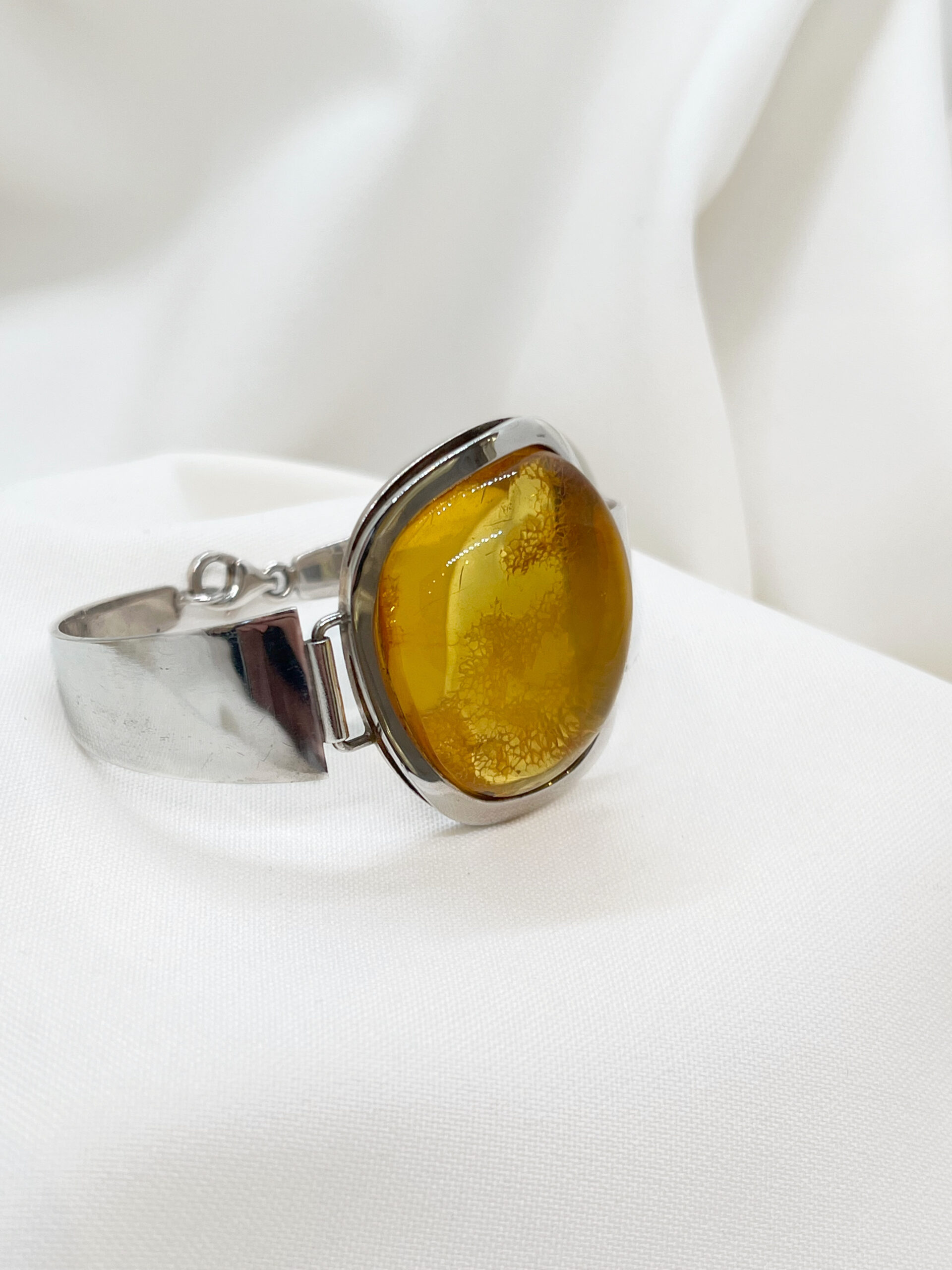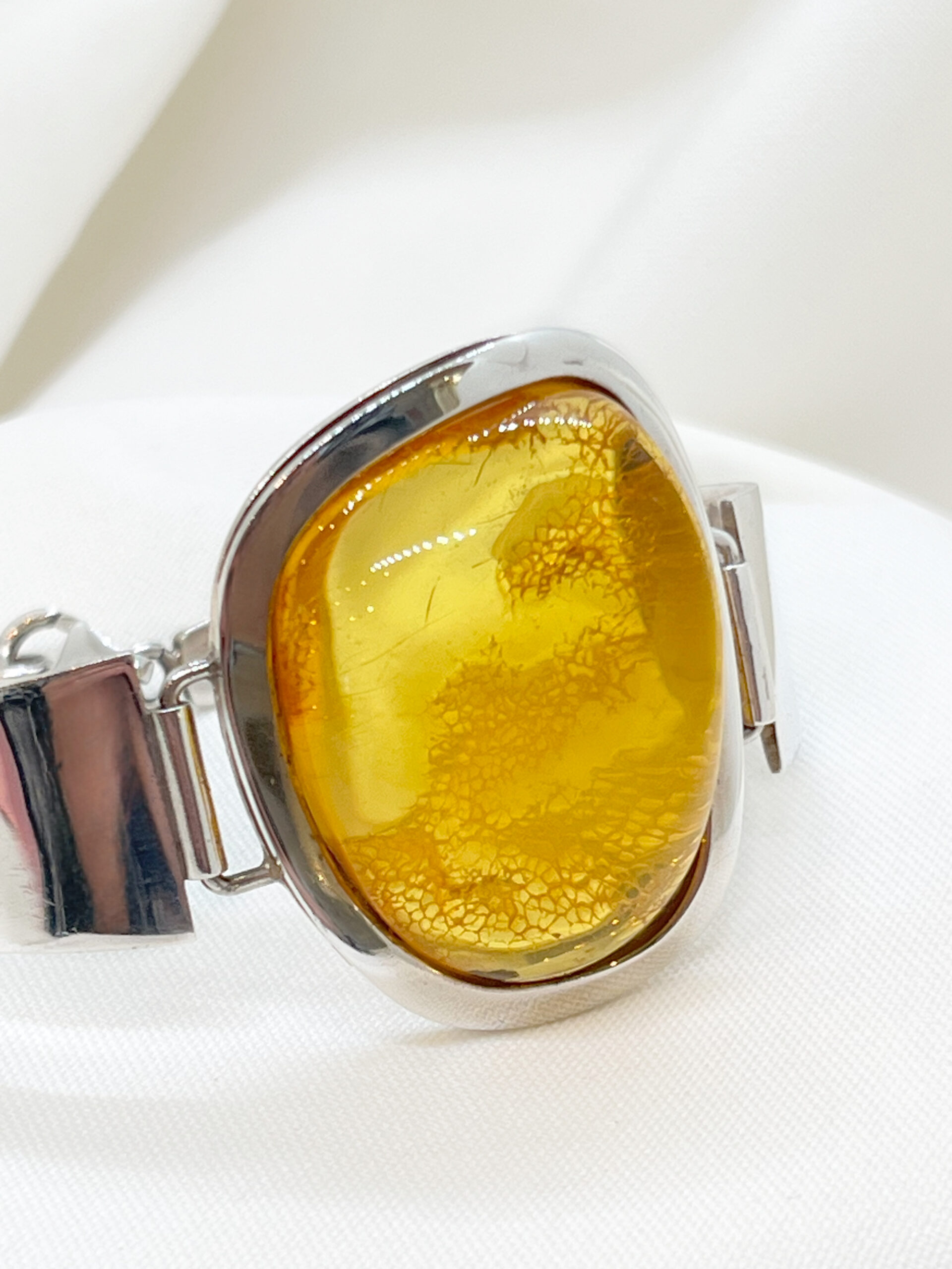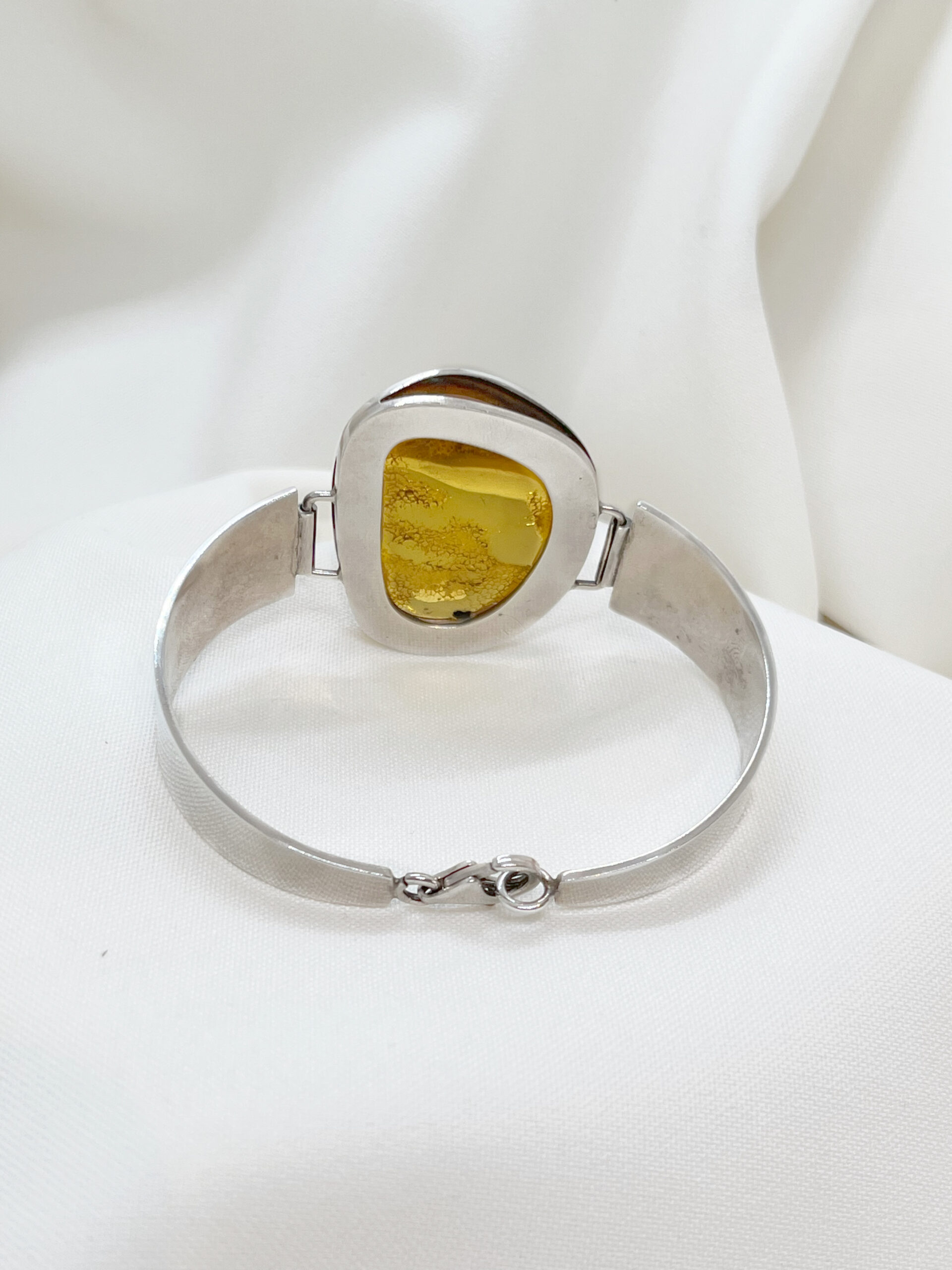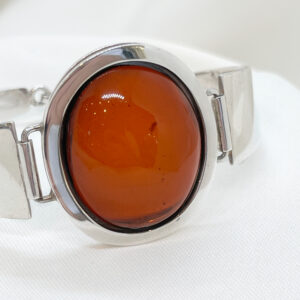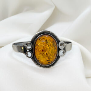Elegancka bransoleta wykonana ze srebra próby 925, ozdobiona naturalnym bursztynem w ciepłym, miodowym odcieniu. Kamień został starannie oprawiony w srebrną ramę, która podkreśla jego naturalny blask i głębię koloru. Bransoleta łączy w sobie klasykę i subtelną elegancję, doskonale komponując się zarówno z codziennymi, jak i wieczorowymi stylizacjami.