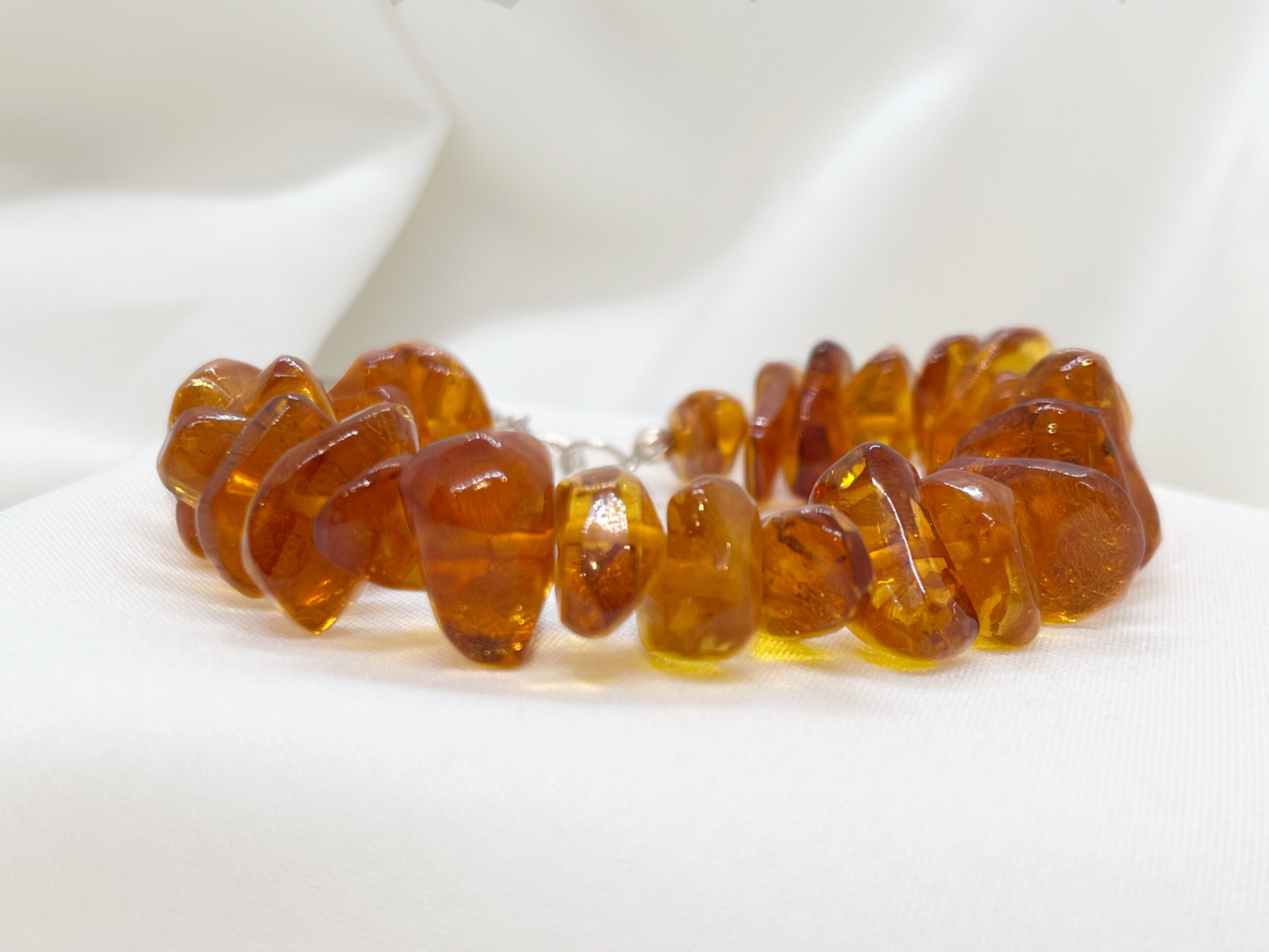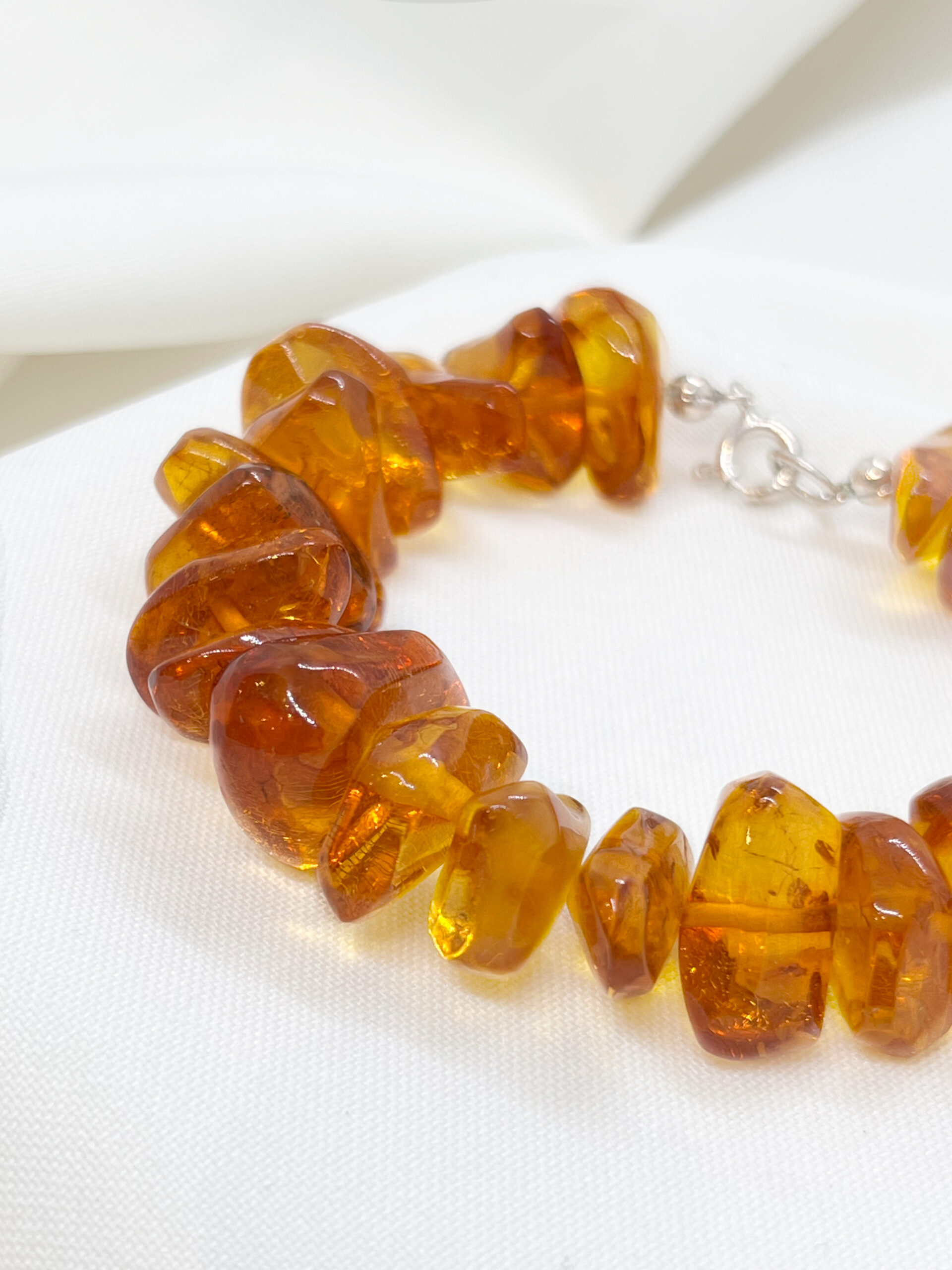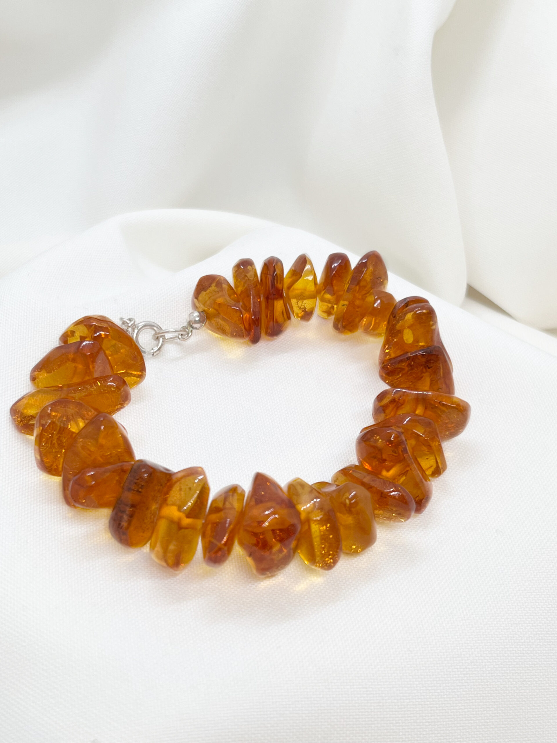 Elegancka bransoletka wykonana z naturalnego bursztynu bałtyckiego w odcieniu koniakowym, zachowanego w nieregularnych kształtach, które podkreślają autentyczność i naturalne pochodzenie kamieni. Każdy element jest inny, dzięki czemu bransoletka jest absolutnie unikalna i niepowtarzalna.