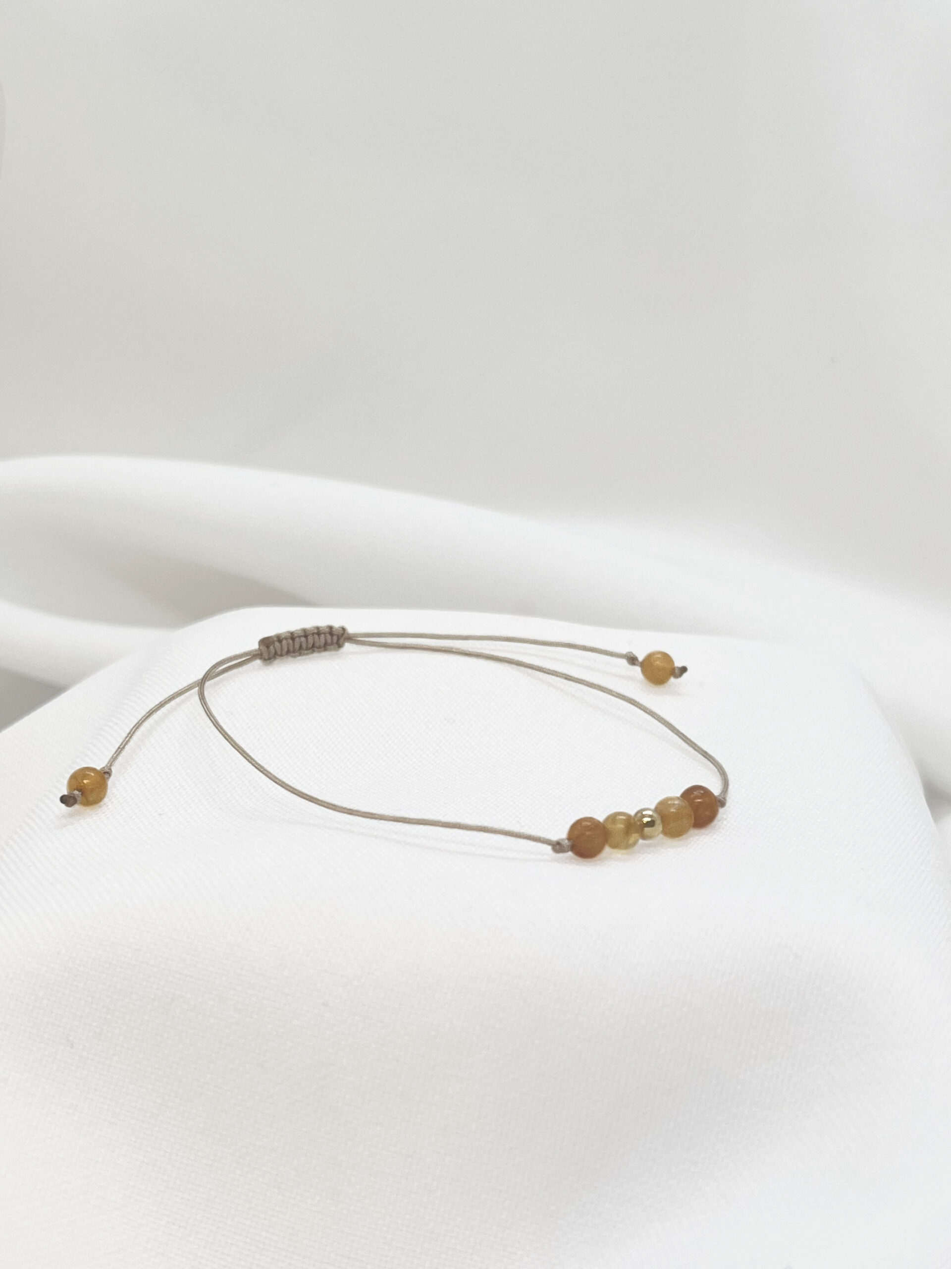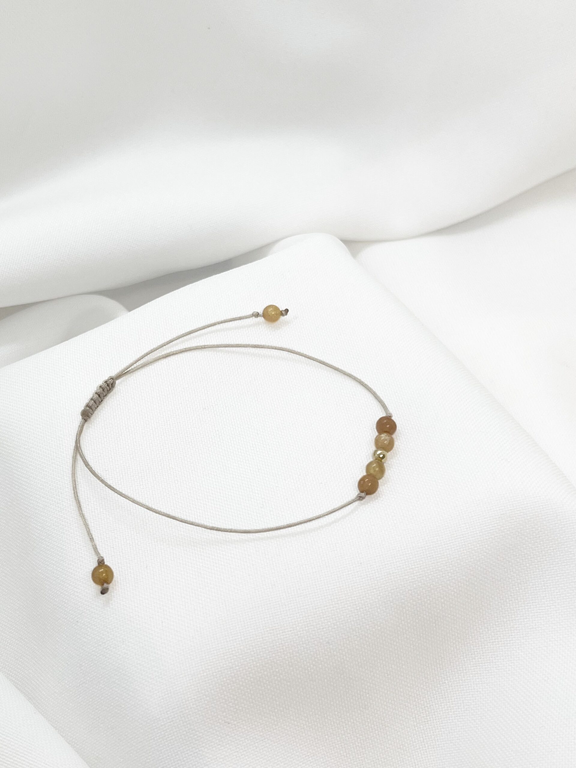 Bransoletka posiada regulowane zapięcie makramowe, dzięki czemu łatwo dopasowuje się do każdego nadgarstka i zapewnia pełen komfort noszenia. To idealne połączenie minimalizmu, naturalności i delikatnego złotego blasku.