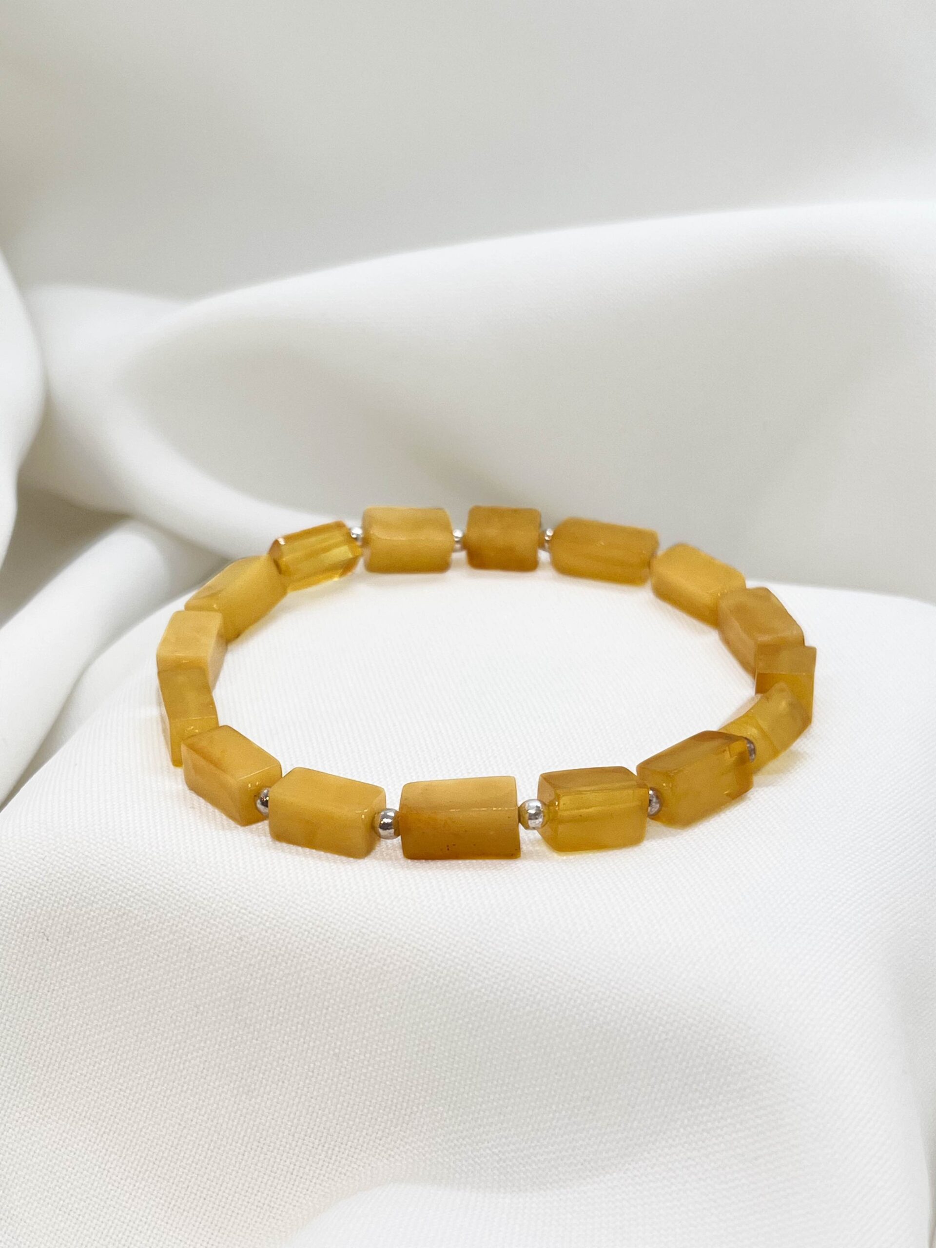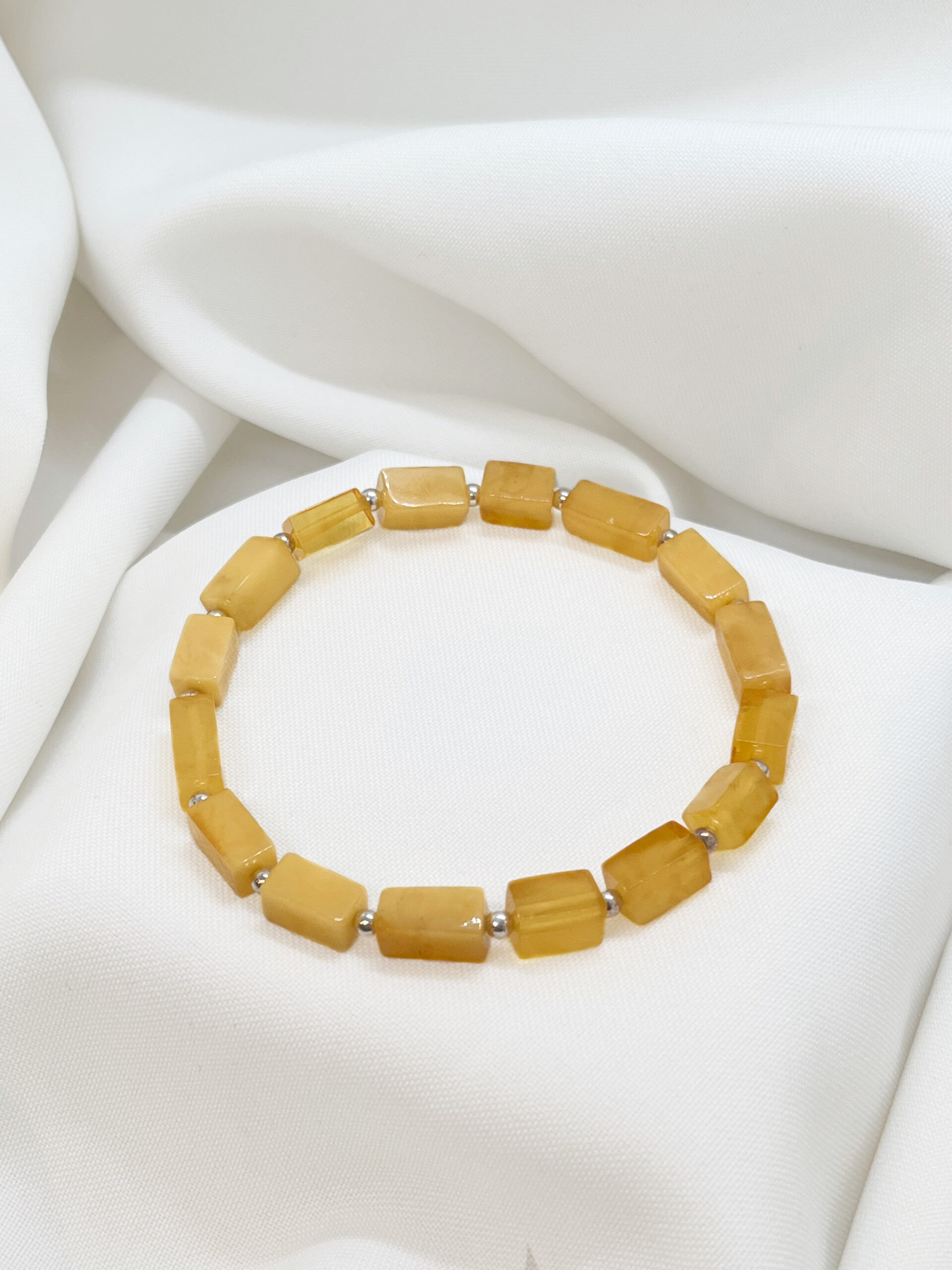 Elegancka bransoletka wykonana z bursztynu bałtyckiego w odcieniach mlecznego i żółtego, którego prostokątne kawałki przełożone są drobnymi kulkami ze srebra 925, tworząc harmonijną, geometryczną kompozycję. Naturalny bursztyn pięknie mieni się w świetle, a srebrne akcenty dodają całości subtelnego blasku i elegancji.