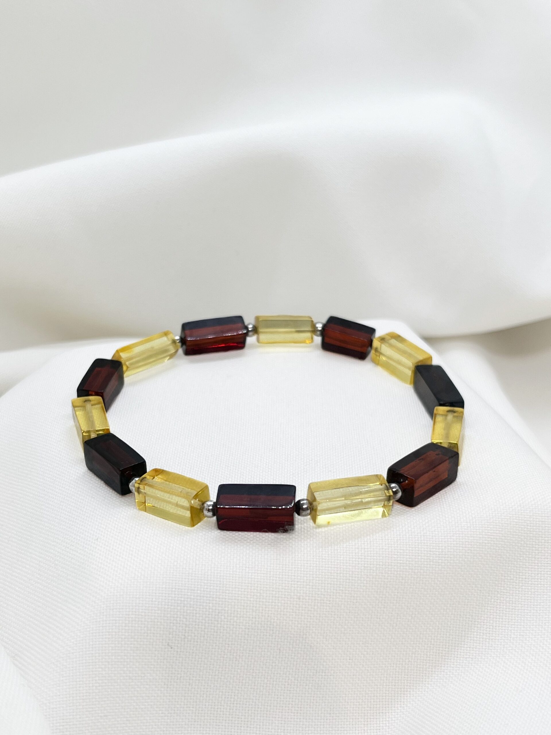 Efektowna bransoletka wykonana z bursztynu bałtyckiego, w której prostokątne kawałki w odcieniach przejrzystego ciemnego koniaku i cytrynowego ułożone są naprzemiennie i przełożone drobnymi kulkami ze srebra 925, co dodaje całości elegancji i subtelnego blasku. Naturalny bursztyn pięknie mieni się w świetle, tworząc wyjątkową, geometryczną kompozycję.