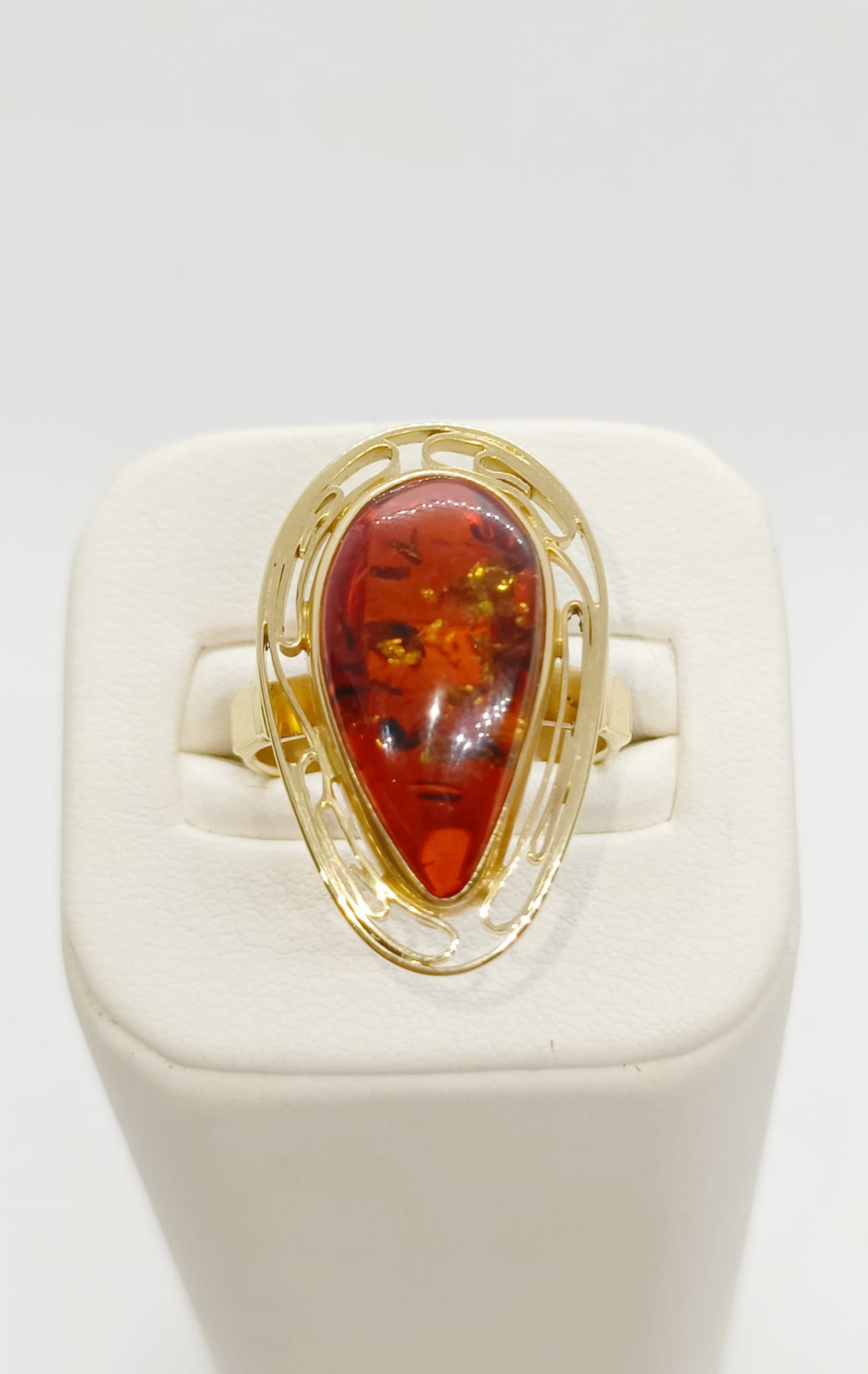 Złoty pierścionek wykonany z żółtego złota 14ct próby 585 zdobiony bursztynem bałtyckim. Jest to unikat, praca wykonana ręcznie.